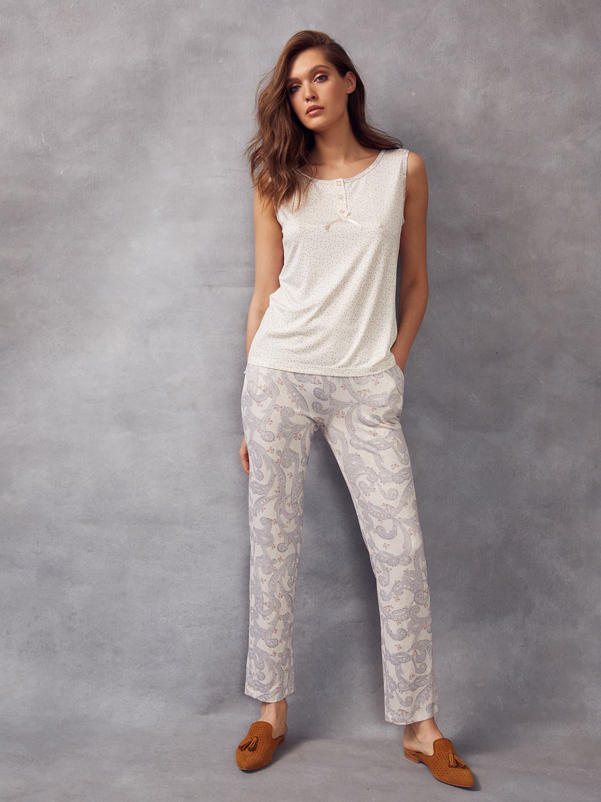 Комплект женский с брюками из принтованной вискозы. Топ прямого силуэта, с круглым вырезом, без рукава, с удлиненным низом по спинке. По центру горловины полочки застёжка-планка на пуговицы, декорированная элегантным бантиком. Брюки прямые на поясе с резинкой, с отрезными карманами.