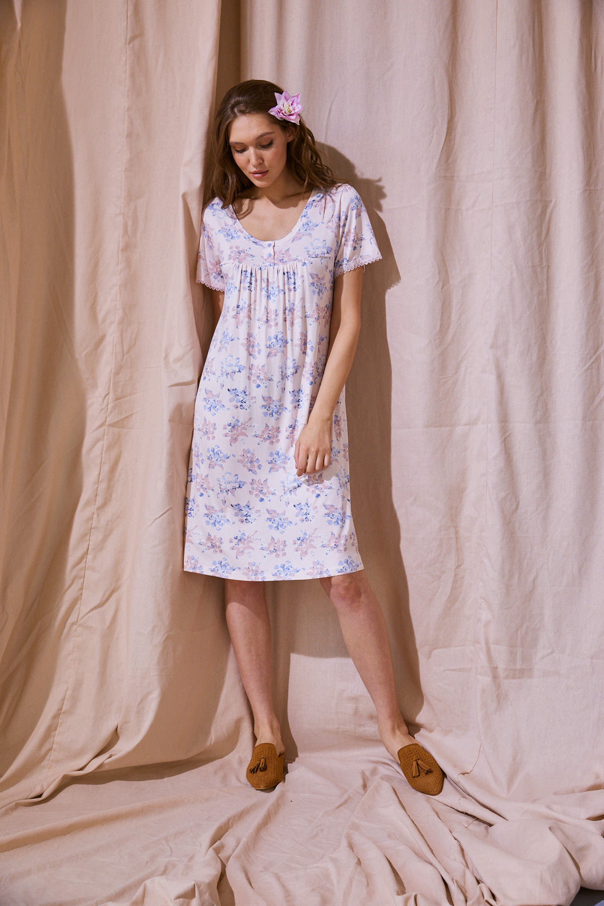 Женская ночная сорочка с коротким рукавом. Легкая и дышащая вискоза в составе приятно ощущается на теле, отлично впитывает влагу, не накапливает статическое электричество и идеально подходит для чувствительной и нежной кожи. Практичная застёжка - планка на 3 пуговицы декорирована кокетливым бантиком.