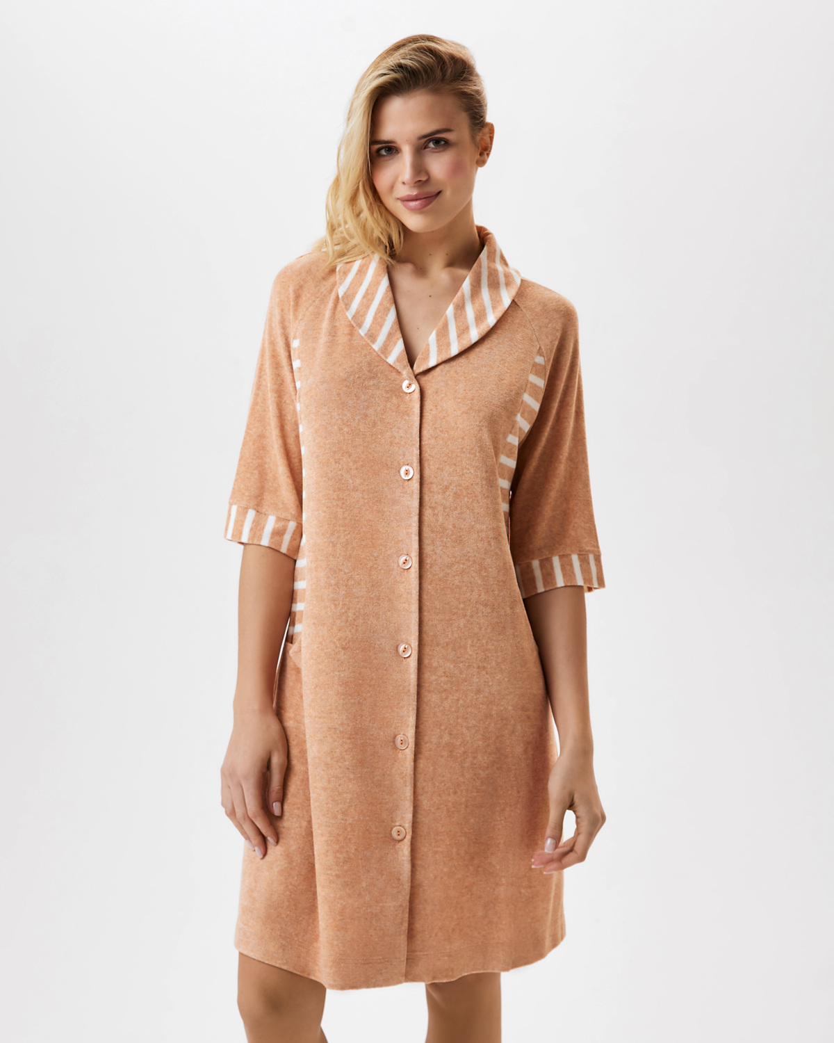 Халат из тонкой махры, прямого силуэта с застёжкой на пуговицы, шалевым воротником, длиной выше колена. На полочке карман, расположенный в фигурном рельефе. Рукав реглан 3/4, низ обработан манжетой.