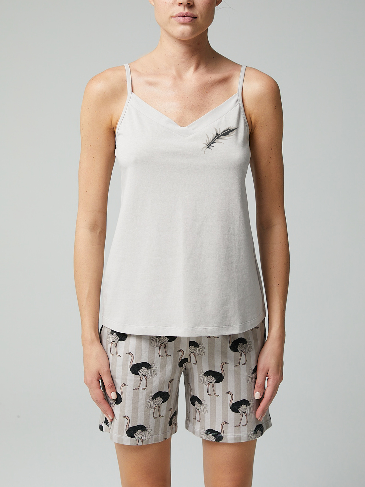 Майка на тонких бретелях, декорирована фигурным вырезом горловины и тематическим принтом на груди. Шорты с карманами по бокам. Пояс на резинке.Легкий и удобный комплект, который комфортно ощущается, и стильно выглядит благодаря оригинальному принту. Отлично подходит для дома и сна.
