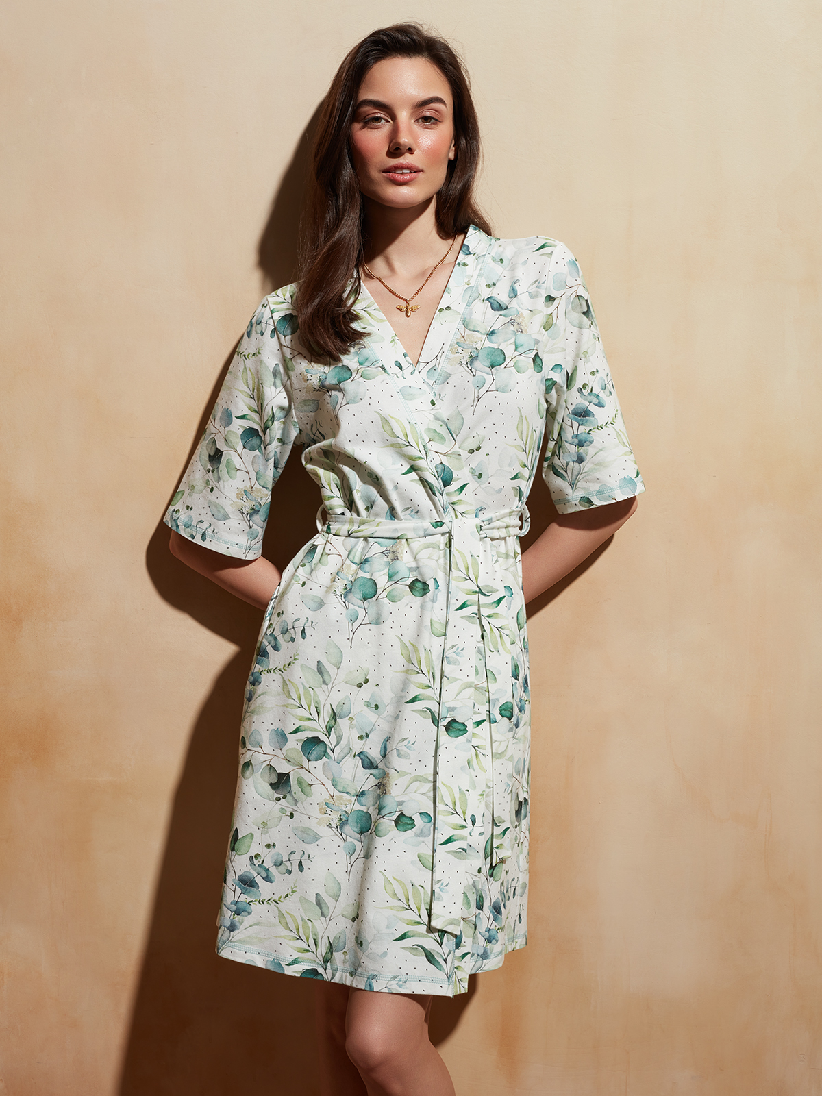 Комфортный халат, который эффектно смотрится благодаря сочетанию прямого силуэта, свободного кроя и стильного растительного принта.