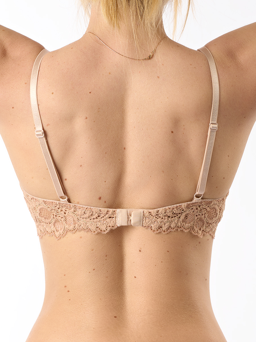 Бюстгальтер из эластичного кружева с мягкой чашкой на косточках. Подчеркивает естественную форму и комфортно распределяет грудь по всему объему чашки. Удобный стан, кружевные боковые детали и регулируемые бретели обеспечивают превосходное облегание и надежную поддержку. Застежка на два крючка создает дополнительный комфорт. Изящное кружево плавно переходит с чашки на бретель.