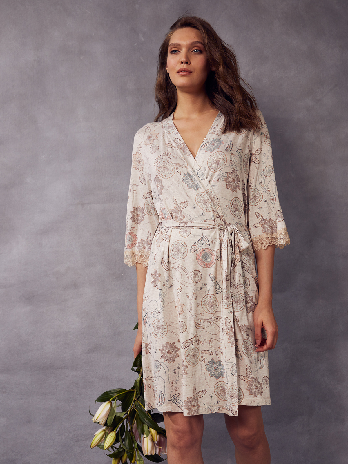 Халат с запахом из принтованной вискозы, прямого силуэта, длиной до колена, завязывается на пояс. Горловина и край борта обработаны обтачкой, в боковых швах расположены карманы. Рукав реглан 3/4, по низу отделка из кружева.
