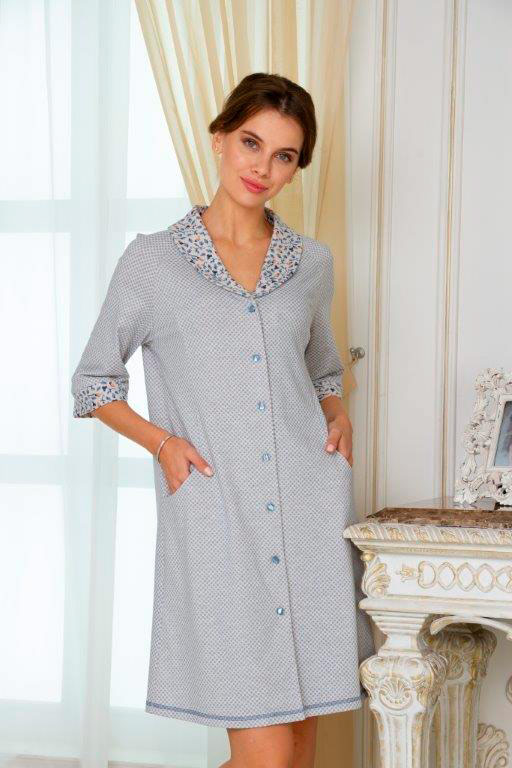 Халат из мягчайшего смесового полотна, прямого силуэта с застёжкой на пуговицы, с шалевым воротником, длиной выше колена. На полочке карман, расположенный в фигурном рельефе. Рукав реглан 3/4, низ обработан манжетой.