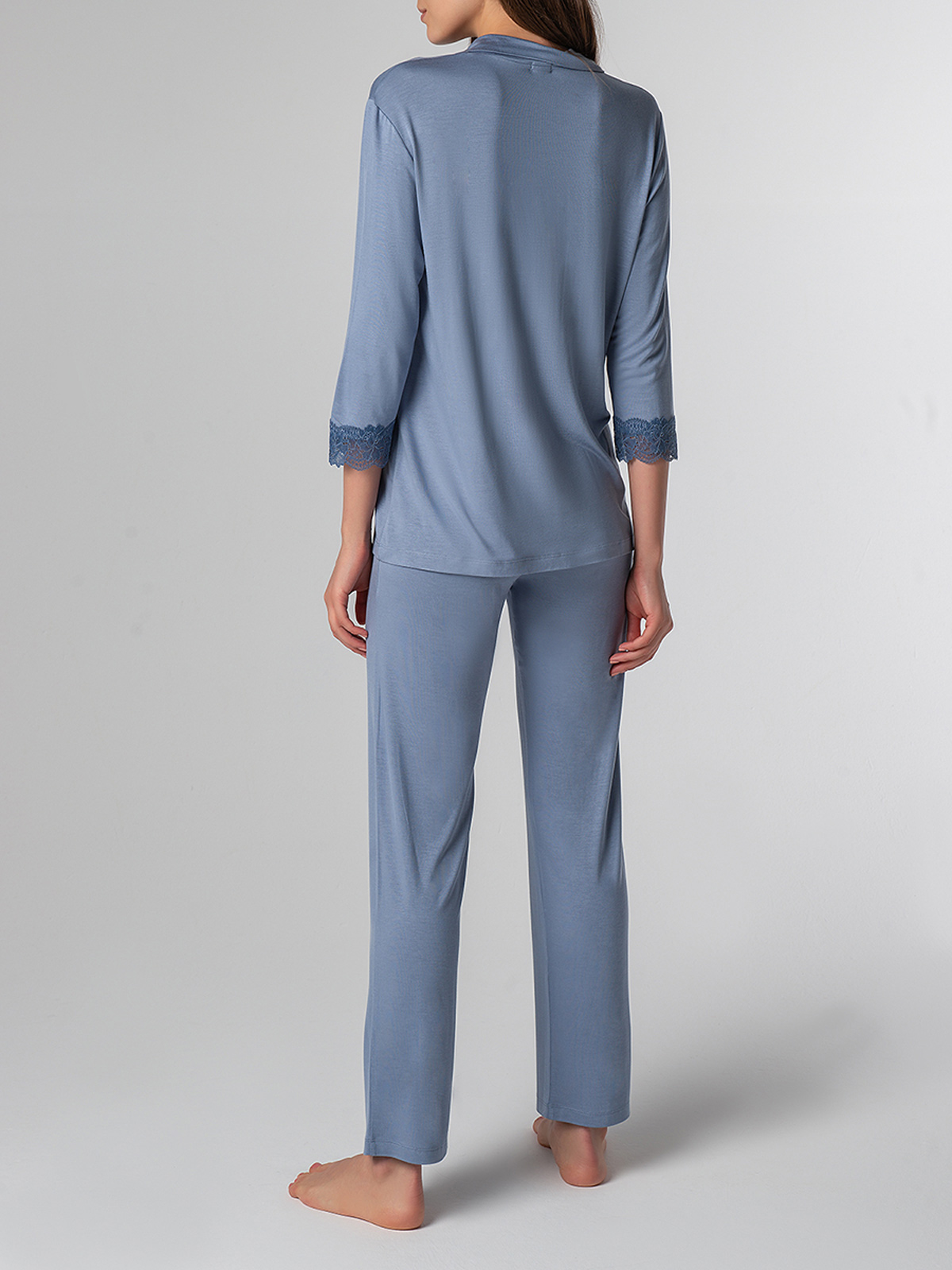 Рубашка прямого силуэта с застёжкой на пуговицы, с английским воротником. На полочке горизонтальные нагрудные вытачки. Рукав втачной 3/4, по низу отделка из кружева.