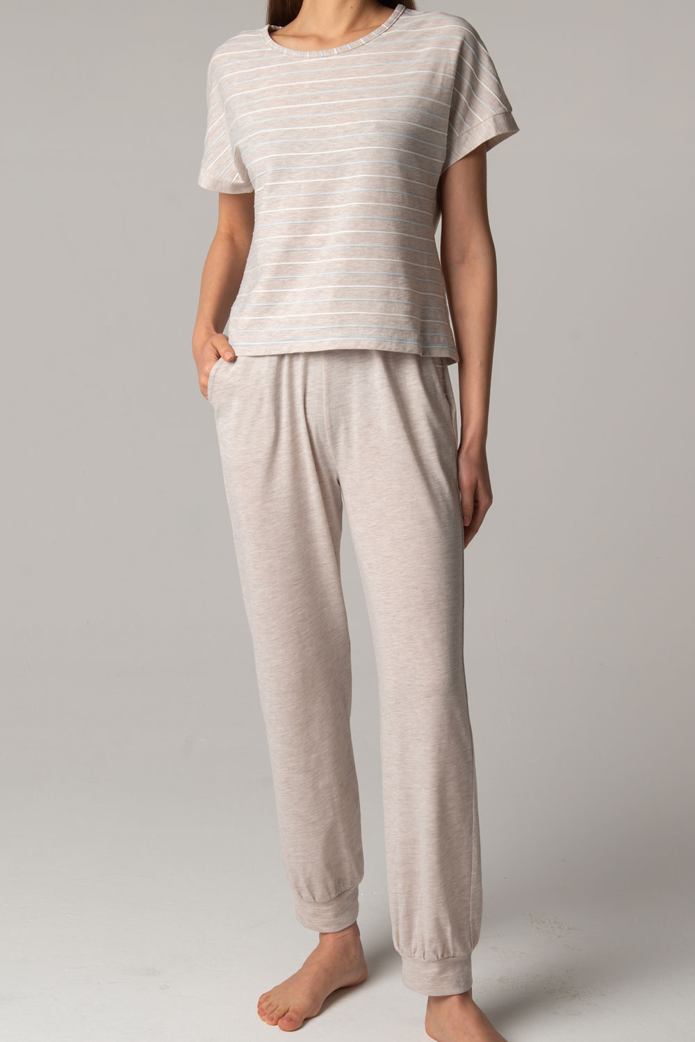 Брюки на поясе с резинкой и декоративным шнуром, с отрезными карманами. Низ брюк обработан манжетой.