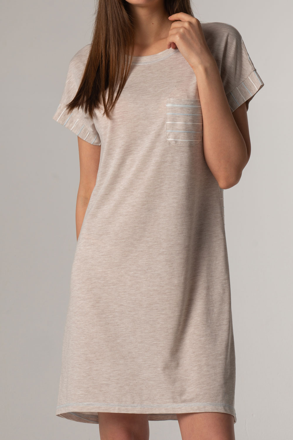 По горловине, верхнему краю кармана и низу платья контрастная декоративная отделочная строчка.
