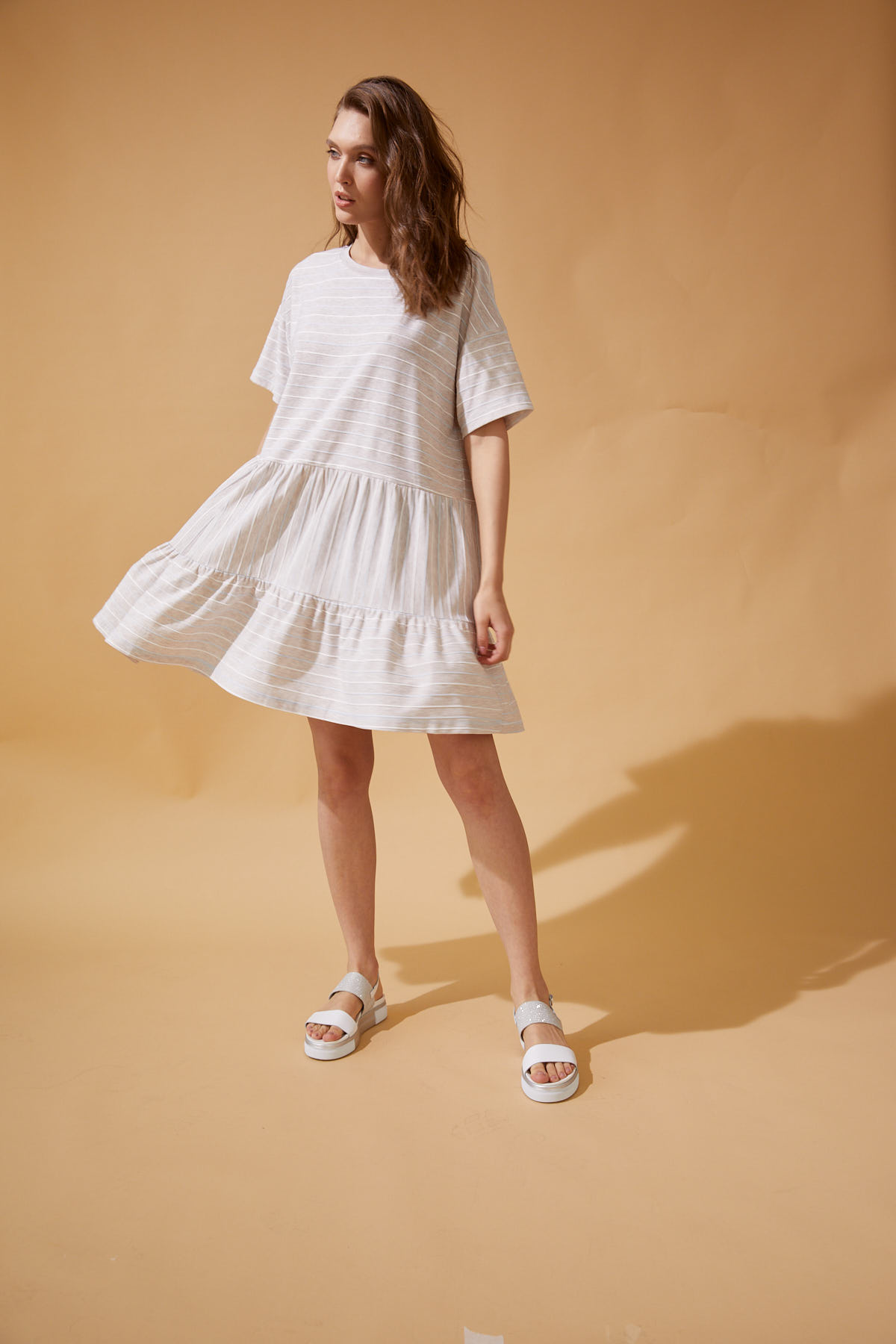 Платье из смесового полотна, свободного покроя, с круглым вырезом и 2-х ярусной юбкой, длиной до колена. Рукав втачной короткий.
