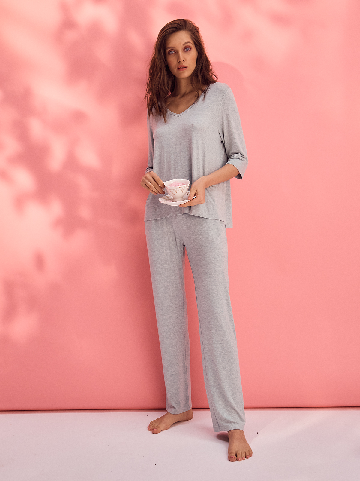 Футболка-Лонгслив с V-образным вырезом, с рукавом до локтя и прямыми брюками с карманами
