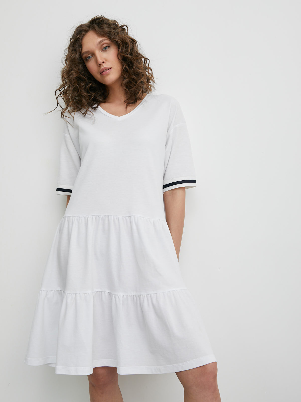 Женское платье - туника с ярусами. В составе - высококачественный, прочный хлопок пенье, который обладает нежной, шелковистой текстурой, сохраняет форму, позволяет коже дышать, отлично впитывает влагу, мягок и приятен на ощупь.