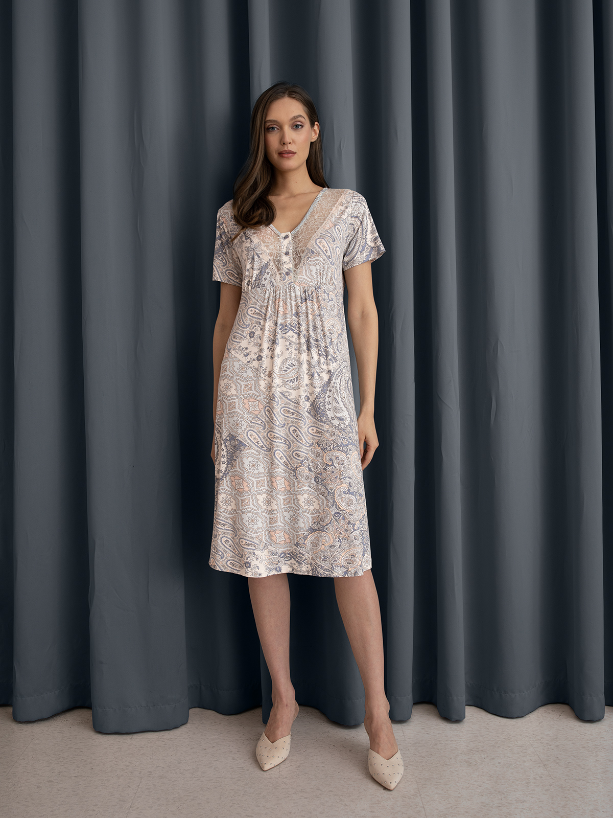 Сорочка из принтованной вискозы прямого силуэта, с V-образным вырезом, длиной до колена. Перед с отрезным лифом, со сборкой. Горловина обработана кружевом, по центру застёжка-планка на пуговицы, декорированная элегантным бантиком. Рукав втачной короткий.