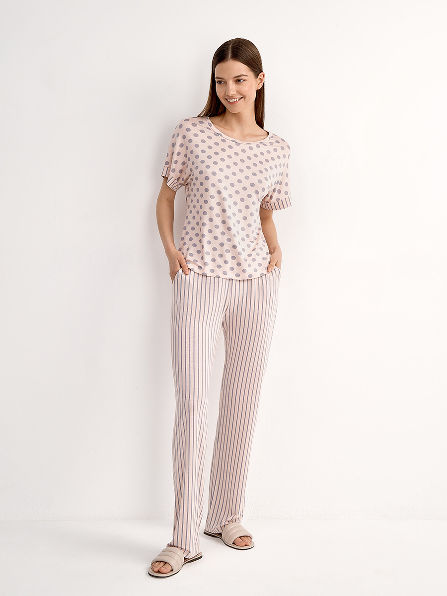 Женская домашняя пижама: свободная футболка со спущенной проймой и круглым вырезом и прямые брюки с карманами на поясе с резинкой. Изготовлена из вискозы, которая отлично пропускает воздух, впитывает влагу, обладает теплообменными свойствами и потрясающе ощущается на теле благодаря шелковистой текстуре. Материал не электризуется и хорошо сохраняет насыщенность цвета. Добавление эластана увеличивает износостойкость.